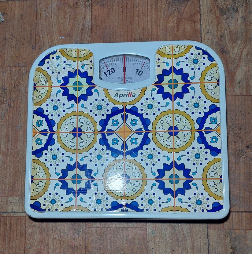 Aprilla marka, renkli mavi desenli mekanik baskül, analog göstergesiyle ağırlık ölçümü yapar. ️