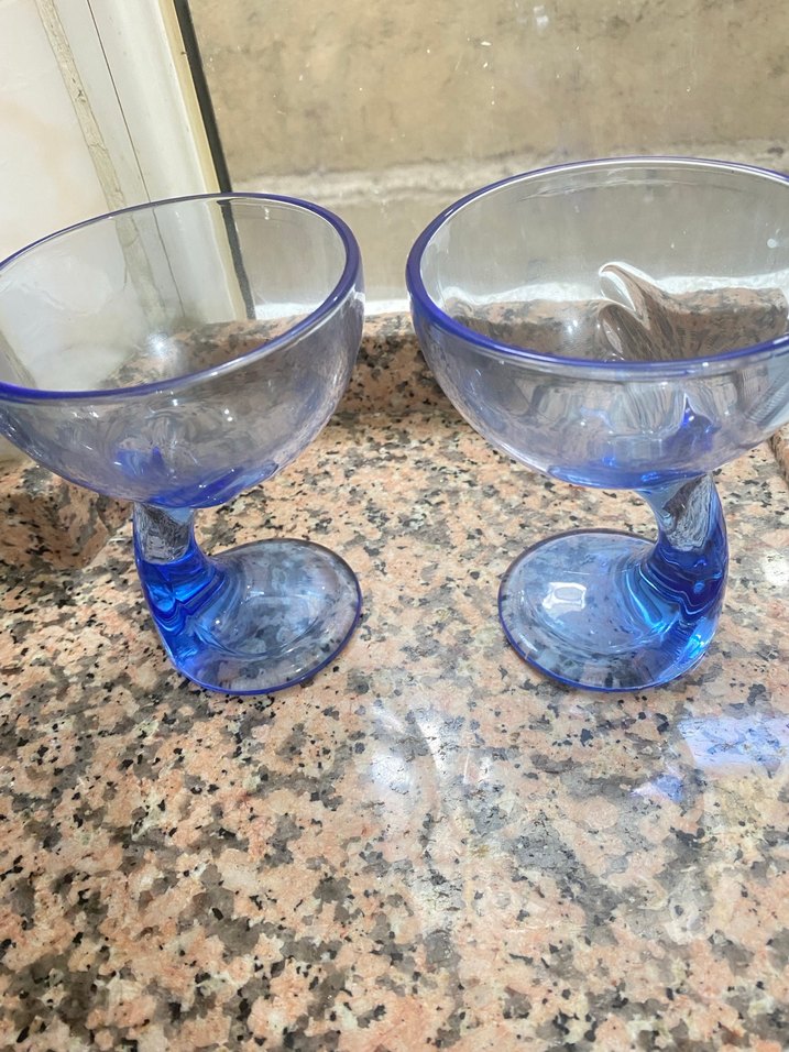 İki adet renkli mavi ayaklı kase bardak. Şeffaf yapısı ile tatlı veya içecek servisinde kullanılabilir. 2adet kupa kırık felan yok
