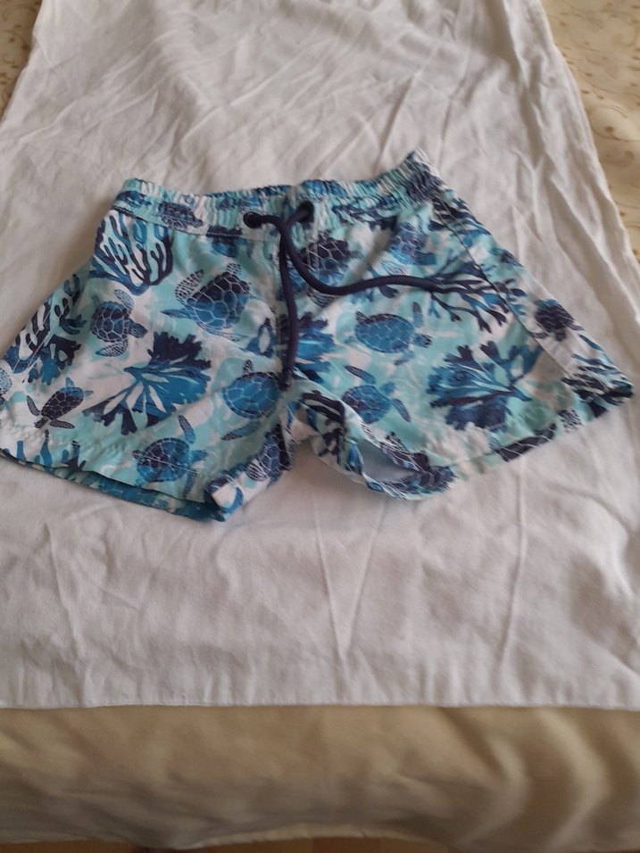 Renkli mavi deniz temalı desenlere sahip, bol kesim erkek mini mayo. Bağcıklı ve düğmeli detay içerir.