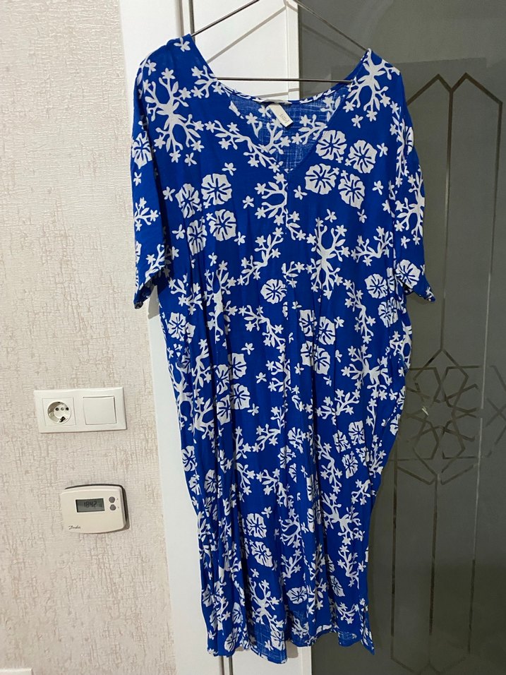 Renkli mavi bağlama desenli, V yakalı, kısa kollu, bol kesim midi uzunlukta hamile geceliği.