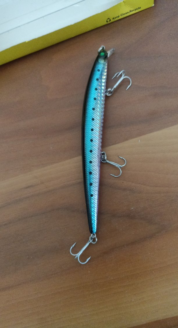 Renkli mavi balıkçı yemi, üçlü çengellerle donatılmıştır ve balıkları çekmek için tasarlanmıştır .