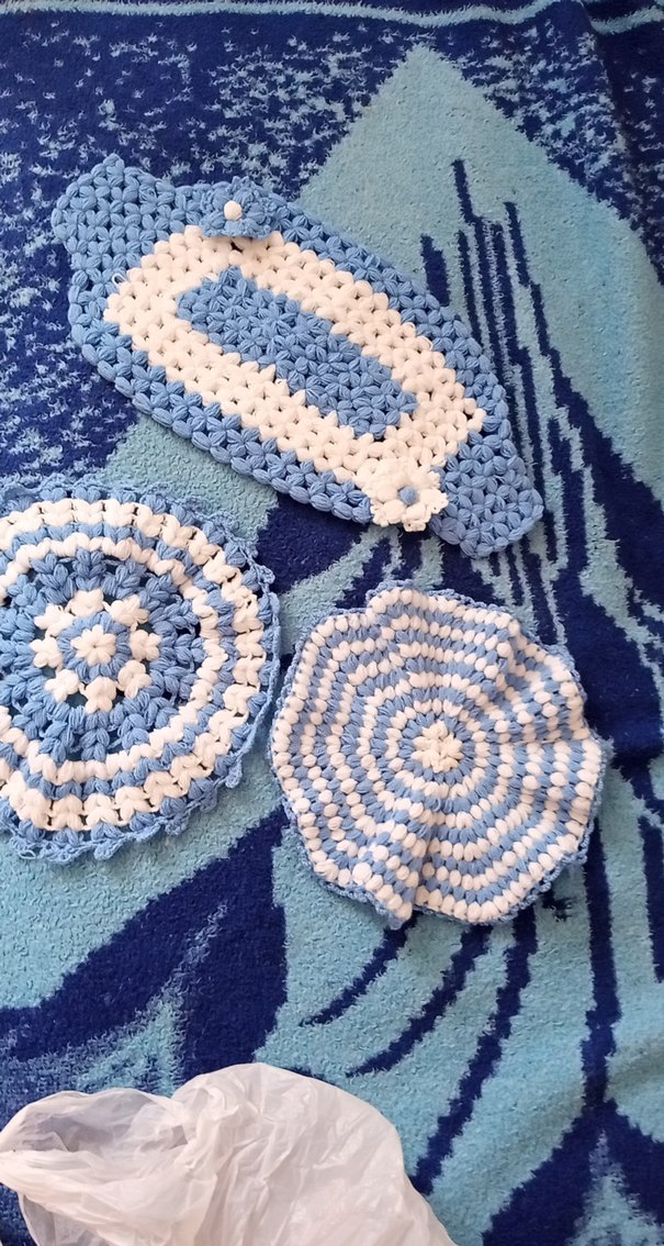 Farklı şekil ve desenlerde renkli mavi banyo süngerleri seti.