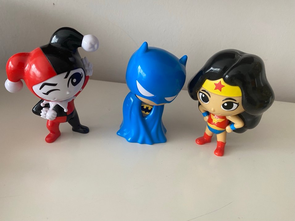 Renkli mavi Batman figürü, pürüzsüz yüzey ve pelerin ile stilize tasarıma sahiptir. 3 adettir