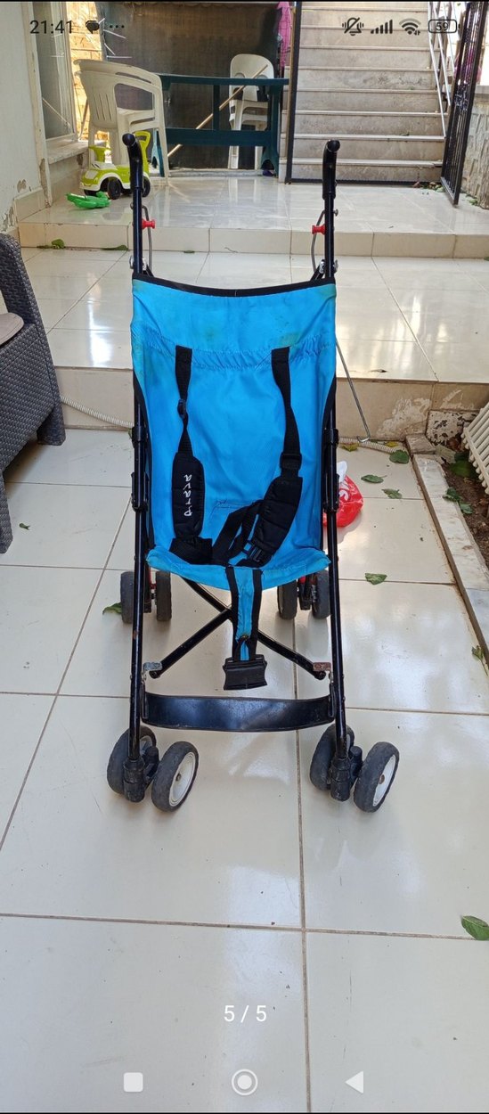 Renkli mavi oturma alanı ve siyah emniyet kemerleri bulunan, kolay hareket ettirilebilen hafif bebek arabası.
