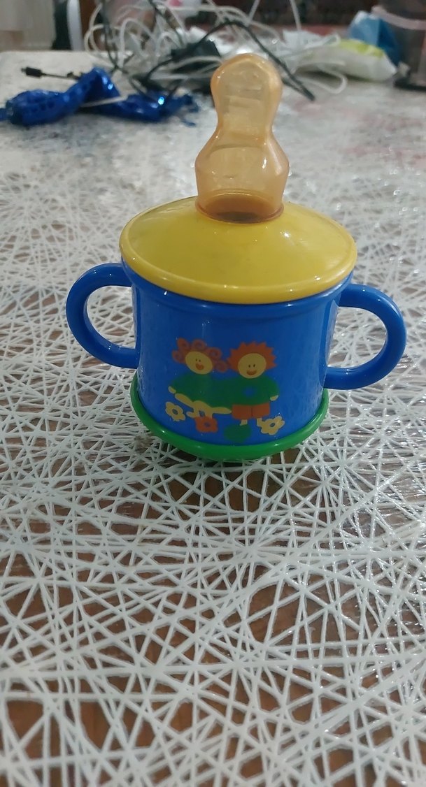 İki kulplu, sarı kapaklı ve yumuşak emzikli mavi renkli bebek biberonu. Çiçek ve gülen yüz desenleri bulunur.