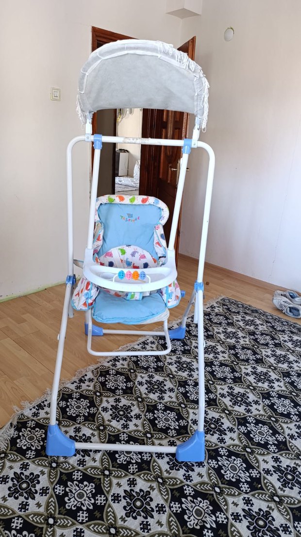 Renkli mavi oturma kısmı ve beyaz iskeleti olan bebek mama sandalyesi. Üstünde tente ve oyuncaklı tepsi bulunur.