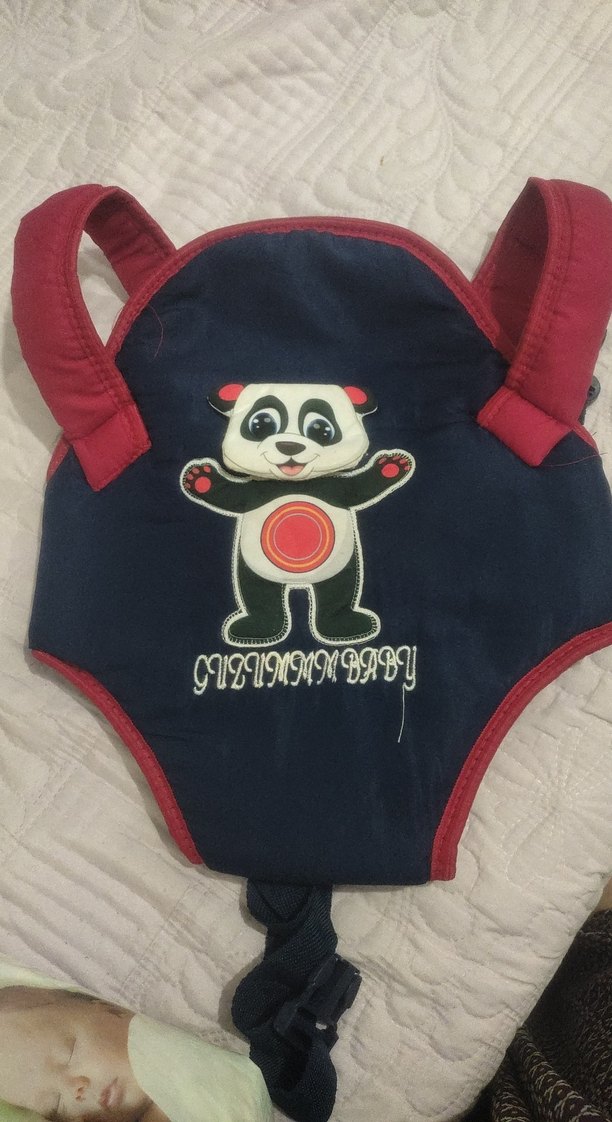 Önünde panda deseni olan kırmızı askılı renkli mavi bebek taşıyıcı. Rahat ve güvenli kullanım sağlar. iki defa tek kulanildi