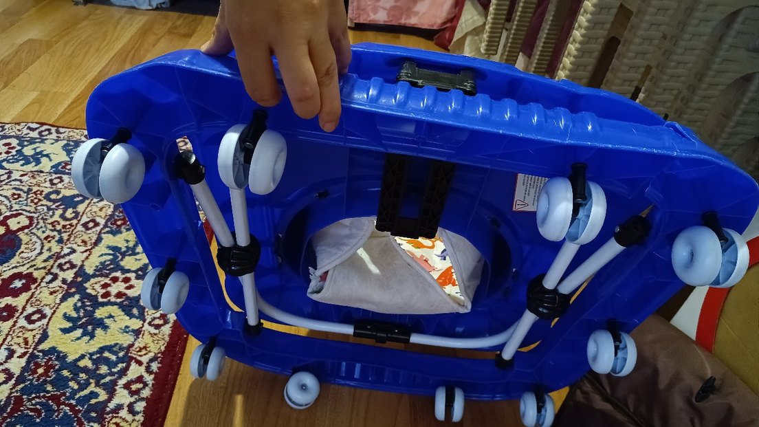 Mavi bebek yürüteci, renkli tasarımı ve kolay hareket için tekerlekli sağlam yapısı ile dikkat çekiyor. İçinde yumuşak bir oturma alanı bulunur.