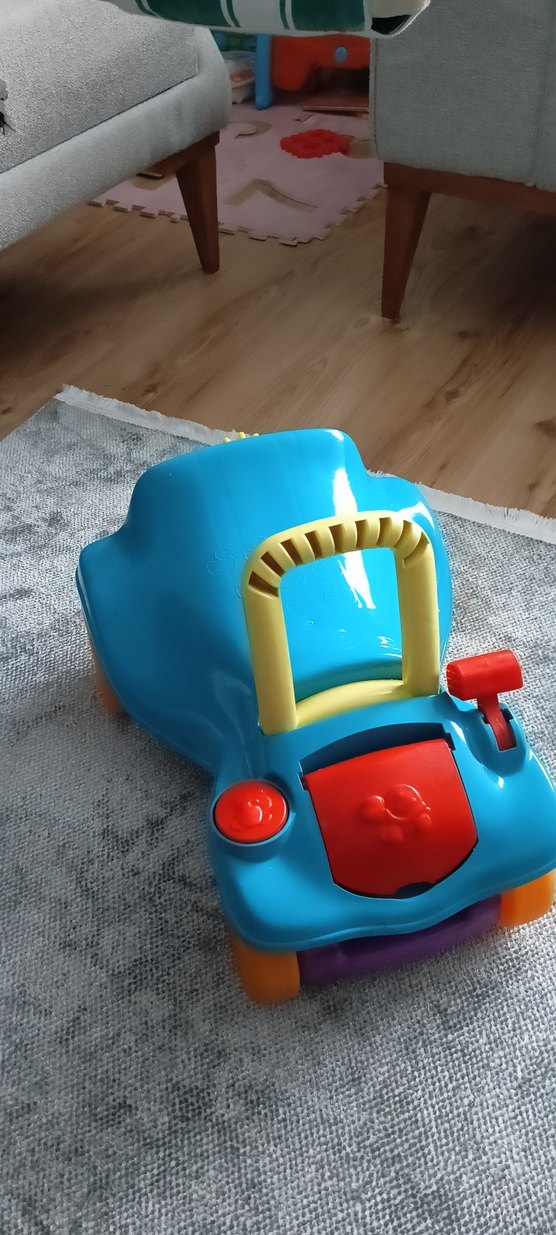 Canlı mavi renkte, sağlam tutamağa ve etkileşimli düğmelere sahip bebek yürüteci. İlk adımlar için destek sağlar.