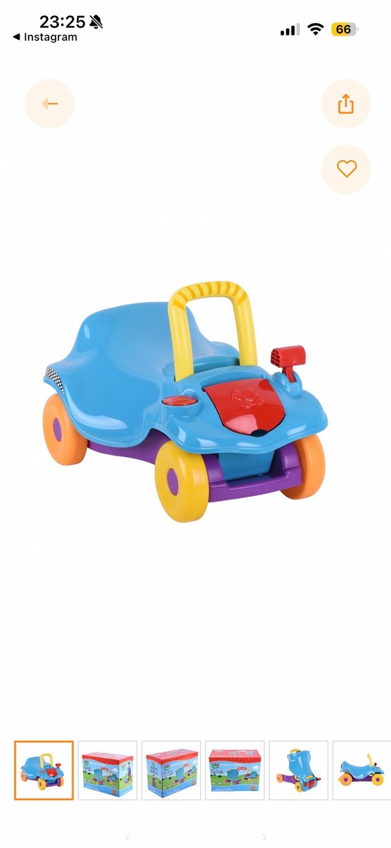 Renkli, mavi gövdeli, sarı, turuncu ve kırmızı detaylı bebek yürüteci. Tutma sapı ve hareket kolaylığı sağlayan tekerlekleri vardır.