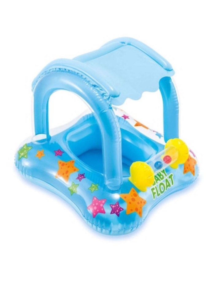 Gölgelikli ve deniz yıldızı desenli renkli mavi bebek yüzme simidi, çocukların suda rahat ve eğlenceli vakit geçirmesini sağlar.