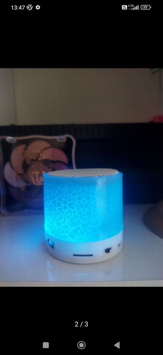 USB ve ses girişli, dokulu yüzeyli, renkli mavi ışıklı Bluetooth hoparlör.