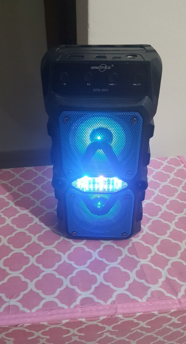 GTS-1571 model renkli Bluetooth hoparlör, canlı mavi ışık ve kompakt tasarımla taşınabilirlik sunar. kırık kısmı fotoğrafta belirtilmiştir. şarjlı, usb girişli Bluetooth hoparlör, temiz kullanıldı. Pazarlık yaparım.