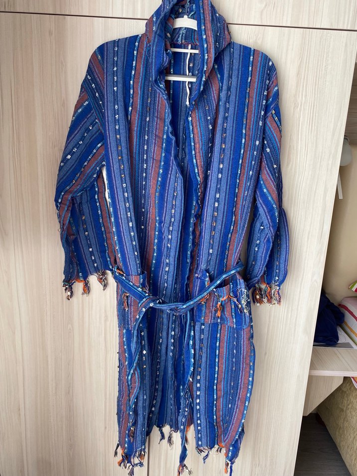 Renkli mavi tonlarda bohem bağlamalı bornoz, püsküllü kenarlarıyla dikkat çeker. İsterseniz plaj kıyafeti olarak isterseniz bornoz olarak kullanabilirsiniz Hiç kullanılmadı Standart bedendir #plajkıyafeti #plajelbisesi #bornoz #kadınbornoz