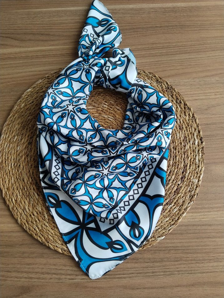 Renkli mavi desenli, bohem tarzda kadın fular, retro ve hippie stil için uygun. ürün ebatı 70×70