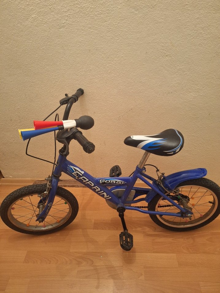 Mavi çocuk bisikleti, renkli gidon korna ve rahat seleye sahiptir, küçük sürücüler için uygundur. 10 yaşa kadar rahatça kullanılabilir.
