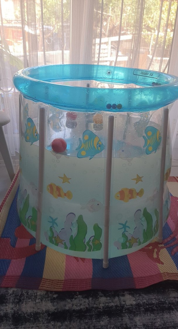 Renkli balık ve sualtı desenleriyle süslenmiş, mavi şişme kenarlı çocuk havuzu. yükseklik 70cm eni 100/80