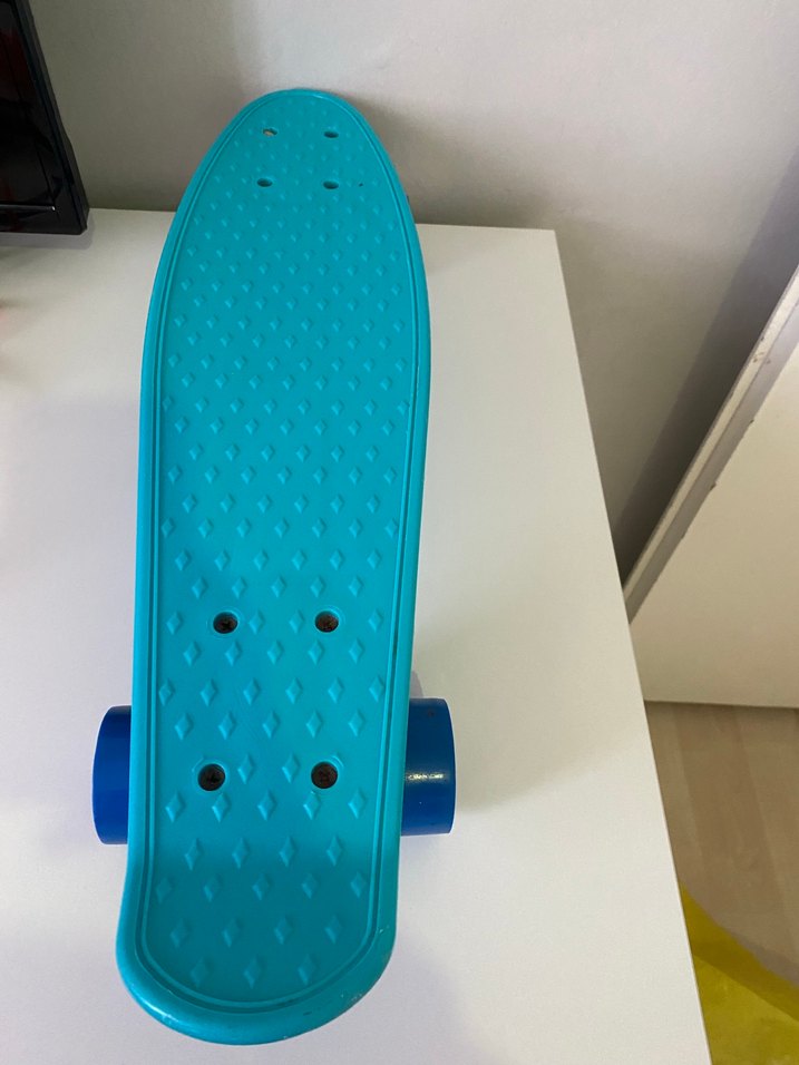 Dokulu taban ve dayanıklı tekerlekleri olan renkli mavi çocuk kaykay. Gayet temiz sadece evde kullanıldı.
