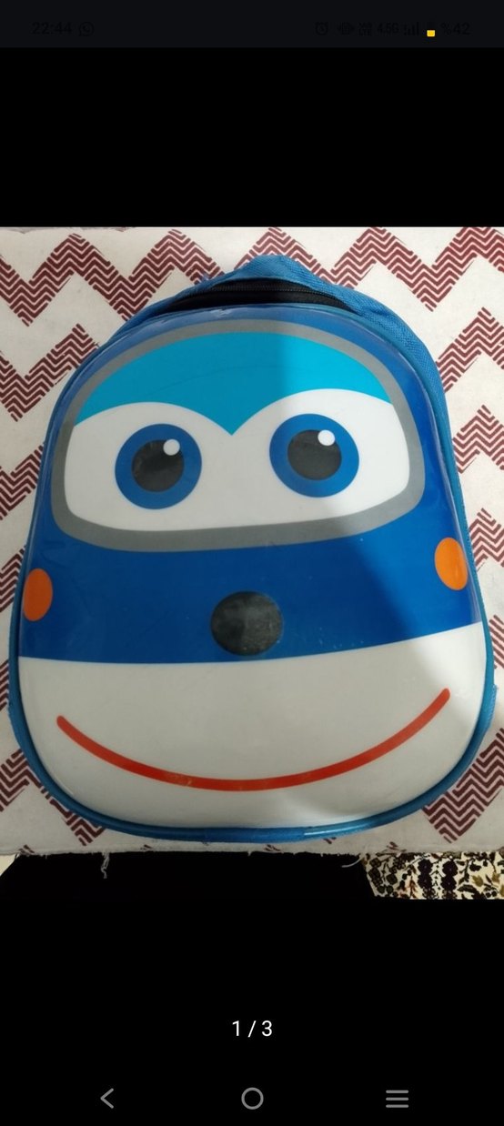 Önünde eğlenceli yüz deseni olan renkli mavi çocuk okul çantası.