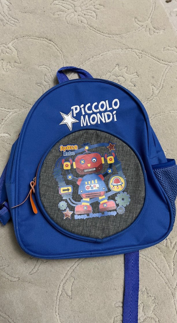 Renkli mavi çocuk okul çantası, Space Robo desenli ve 'PiCCOLO MONDi' yazılıdır. Yanında file cep bulunur.