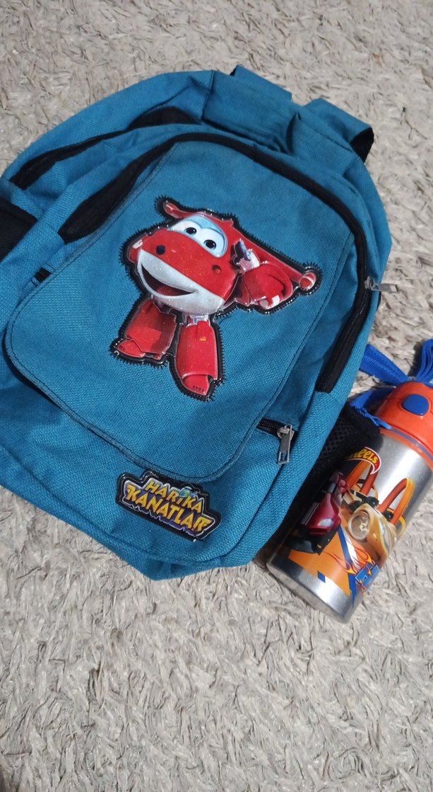 Mavi renkli çocuk okul çantası, renkli uçak figürü ve çoklu fermuarlı bölmeler içerir, yanında uyumlu su matarası vardır. ✈️arka alt kısımda soyulma dışında sorunu yoktur suluk matara sıfır kullanılmamış çanta az kullanılmıştır