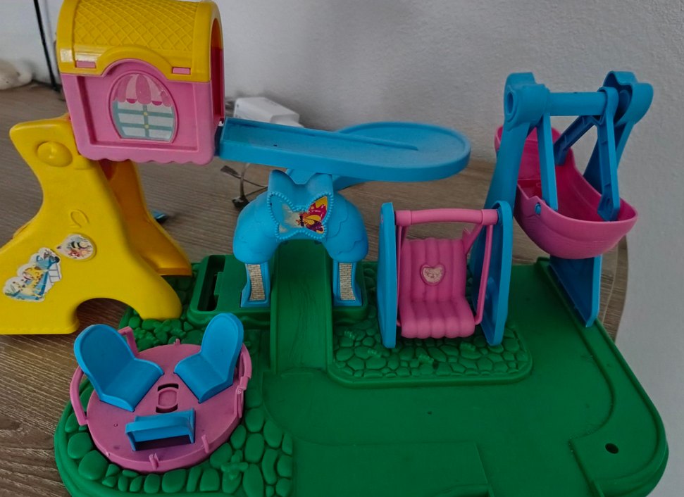 Mavi ve pembe renklerde kaydırak ve salıncak içeren renkli çocuk oyun seti.