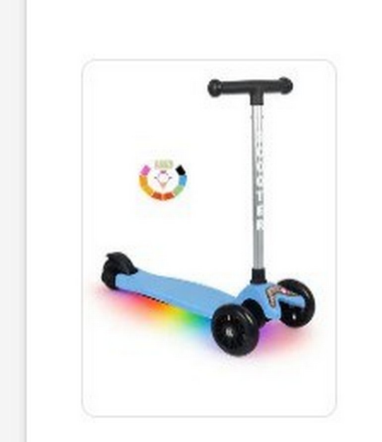 Renkli mavi tabanlı, üç tekerlekli çocuk scooterı. Altında LED ışıklar bulunur ve tutma kolu vardır.