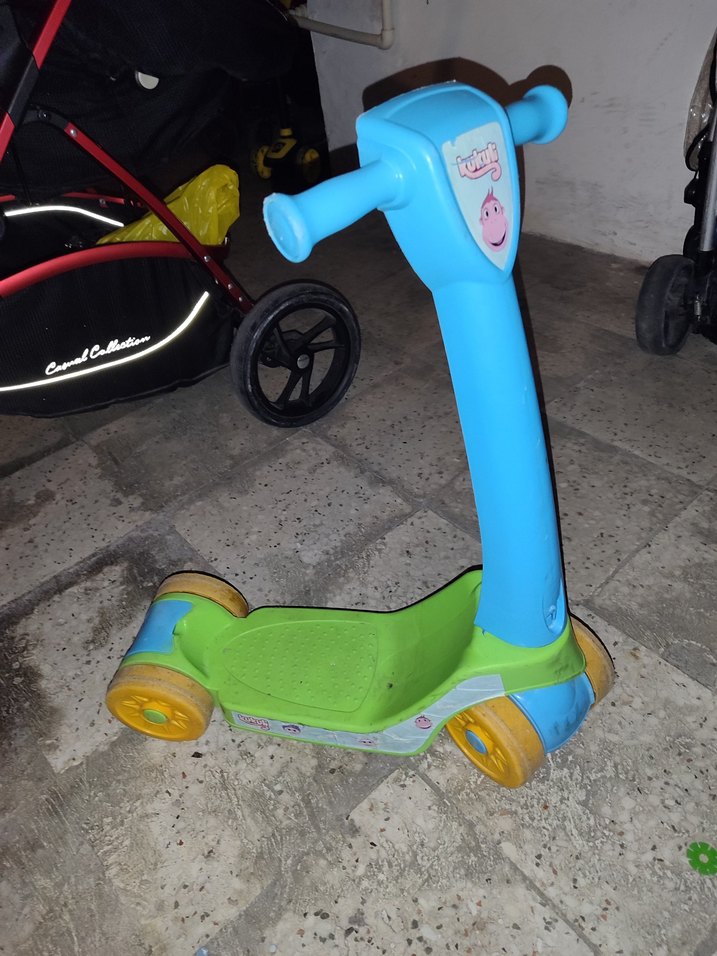 Sağlam tabanlı, dört sarı tekerlekli, renkli mavi çocuk scooterı. Rahat tutacaklar ve yeşil ayak tahtası ile kolay sürüş sağlar.