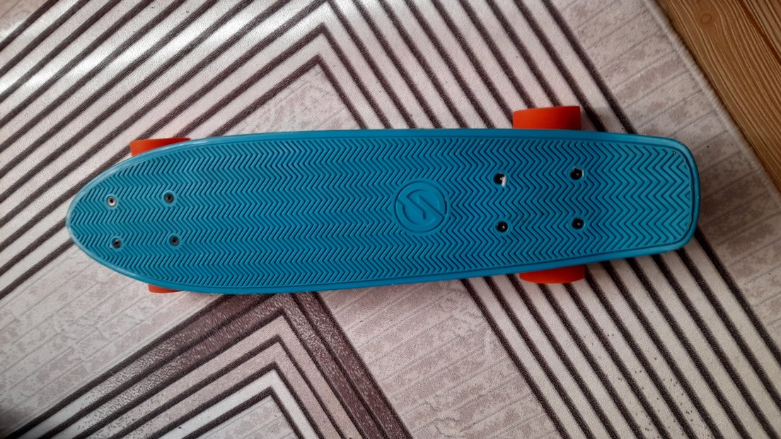 Kaymayı önleyen desenli mavi taban ve canlı turuncu tekerlekler ile renkli çocuk scooterı.