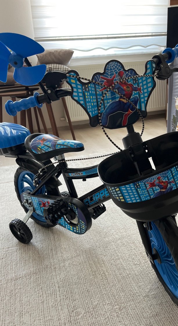 Süper kahraman temalı renkli mavi üç tekerlekli bisiklet, ön sepet ve yardımcı tekerleklerle donatılmıştır. Küçük çocuklar için uygundur.