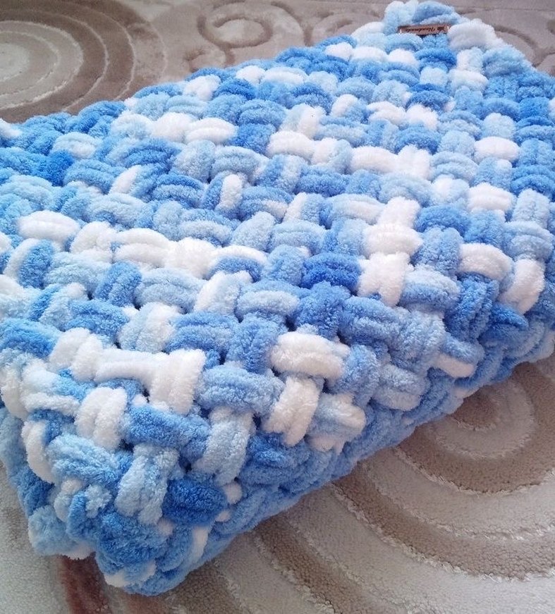 Renkli mavi tonlarında bağlama desenli, yumuşak örme kumaştan yapılmış çocuk battaniyesi. Sıcacık ve rahat kullanımı sağlar.