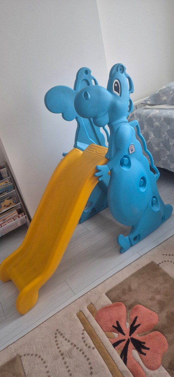 Sağlam plastikten yapılmış, mavi dinozor şeklinde renkli çocuk kaydırağıdır. İç mekanlarda eğlence sağlar.