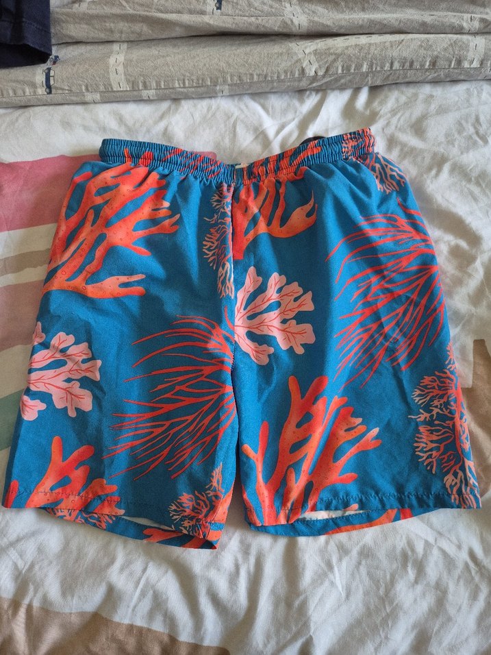 Renkli mavi taban üzerine canlı mercan desenleriyle düğmeli, bol kesim erkek mini mayo. Sahil için bohem tarzda. 9 10 yas