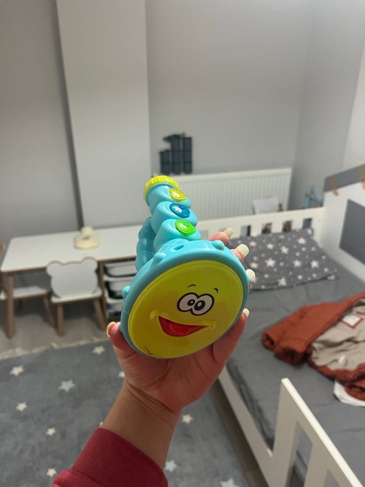 Renkli mavi eğitici oyuncak, çocukların öğrenmesini oyunla destekleyen interaktif düğmeler ve gülen yüz içerir.