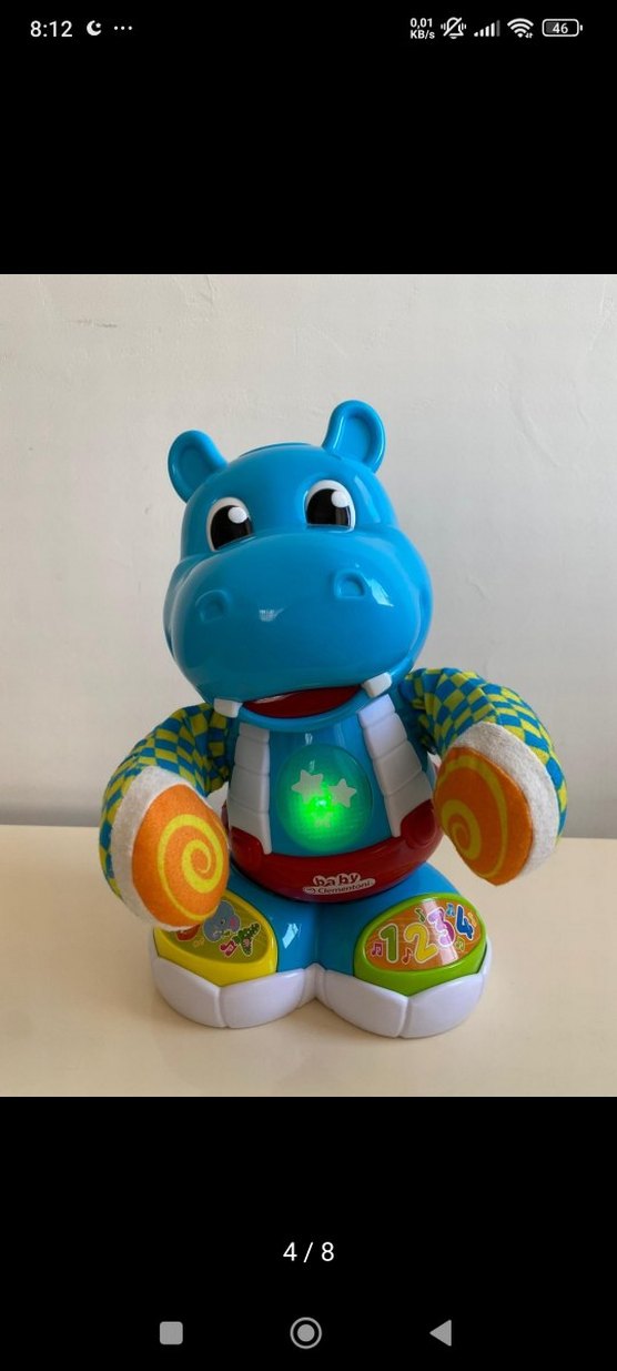 Renkli mavi eğitici oyuncak hipopotam, ışıklı ve sayılarla şekiller içeren düğmelere sahip. çalışır durumda.