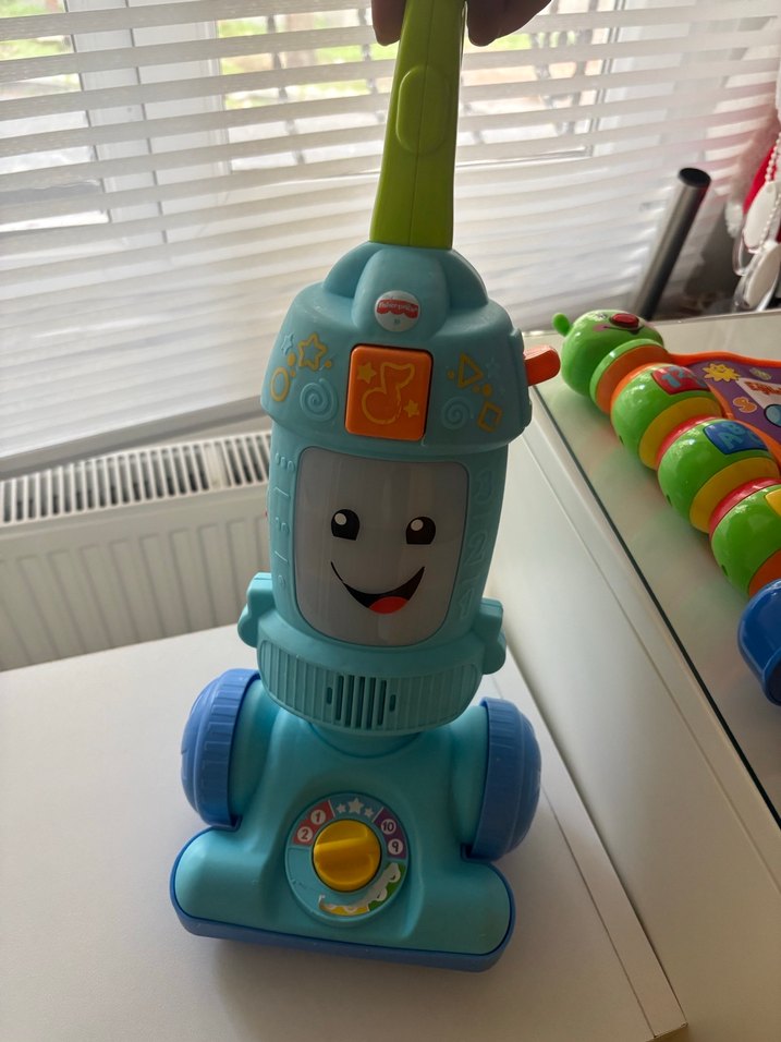 Oyun yoluyla öğrenmeyi teşvik eden, eğlenceli düğmeli ve gülümseyen yüzlü renkli mavi eğitici oyuncak süpürge.
