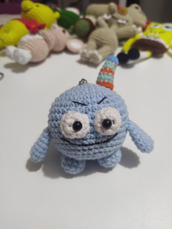 Yuvarlak gözlü, çok renkli boynuzlu mavi el örgüsü peluş anahtarlık. Yumuşak ve el yapımı. Coton iple örüldü. 9 cm Toplu alım için lütfen mesaj atınız #anahtarlık #hediyelik #hediye #örgü #mavi #canavar