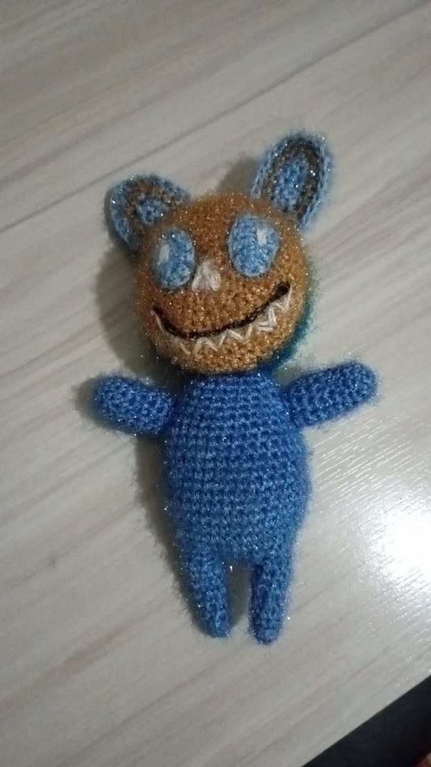 Renkli mavi el örgüsü peluş oyuncak, belirgin yüz detayları ve yumuşak kumaş ile.