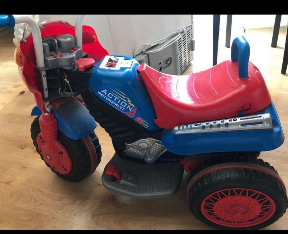Kırmızı oturaklı, ayak dayama yerli renkli mavi elektrikli çocuk motorsikleti. Çocukların güvenle kullanabileceği bir üründür. ️aküsü yok