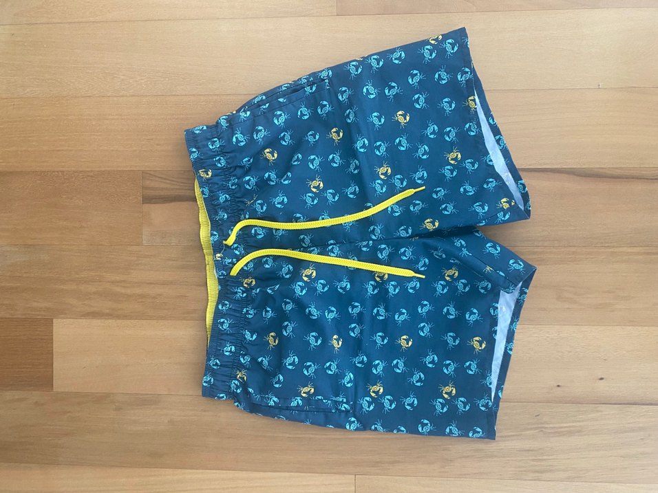 Renkli mavi erkek mayo şortu, yengeç desenli ve sarı bağcık detaylı, plaj ve havuz için rahat ve şık.