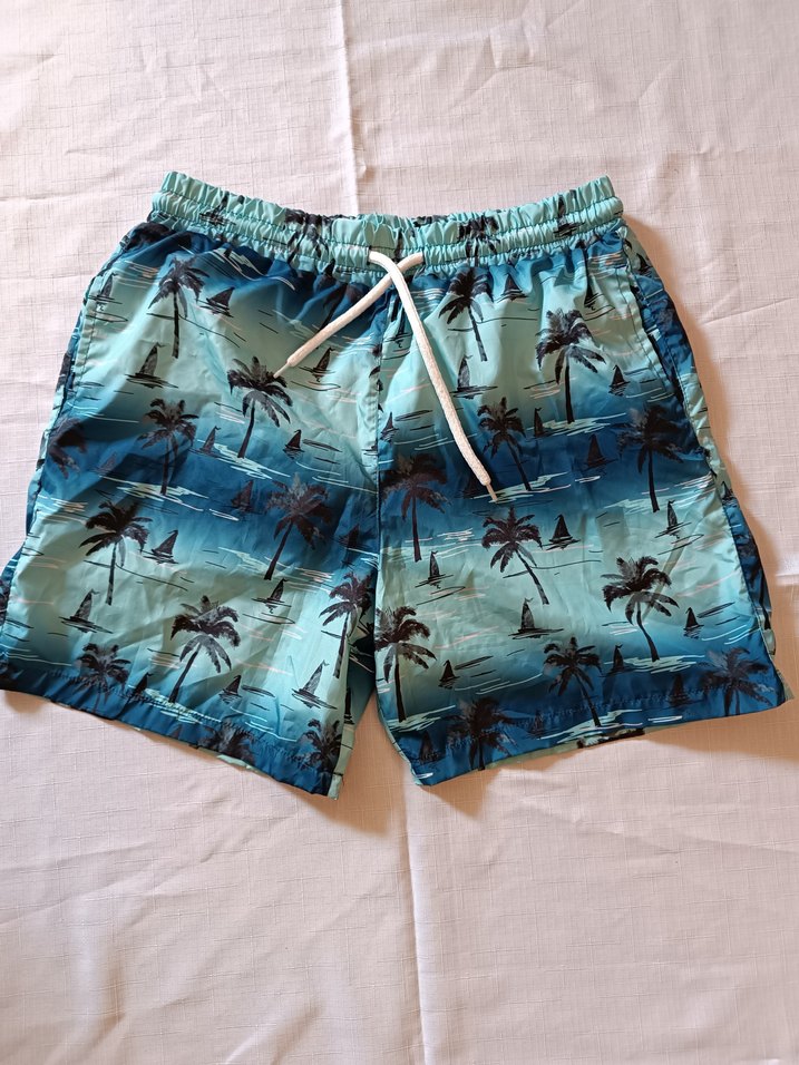 Renkli mavi tie-dye desenli, palmiye baskılı, bol kesim erkek mini plaj şortu. Düğmeli tasarım ve bağcıklı elastik bel içerir.