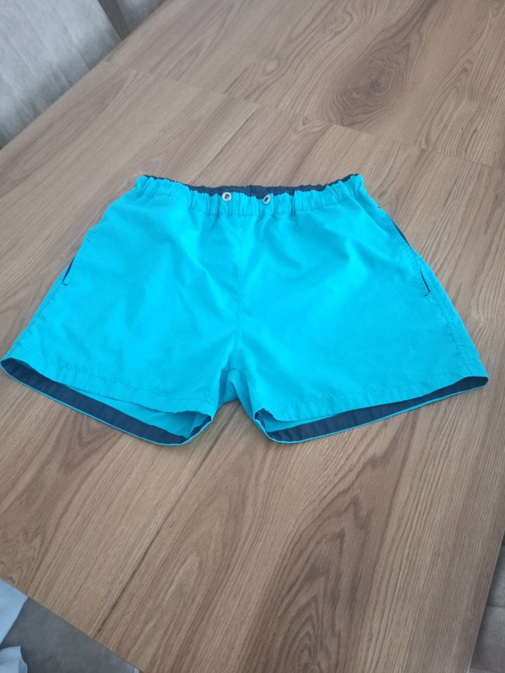 Renkli mavi, kemerli ve bol kesim erkek mini şort. Plaj ve sokak stili için uygun, desensiz ve sade tasarım.