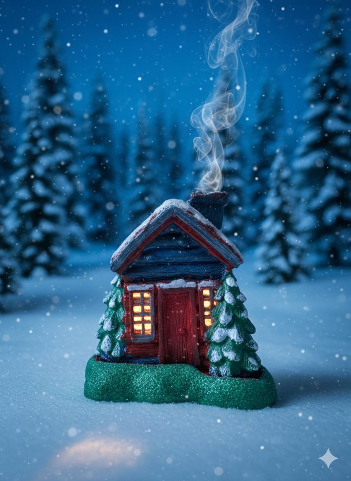 Pencereleri ışıklı, bacasından duman çıkan renkli mavi ev figürü, karlı bir orman fonunda yer alıyor. ❄️