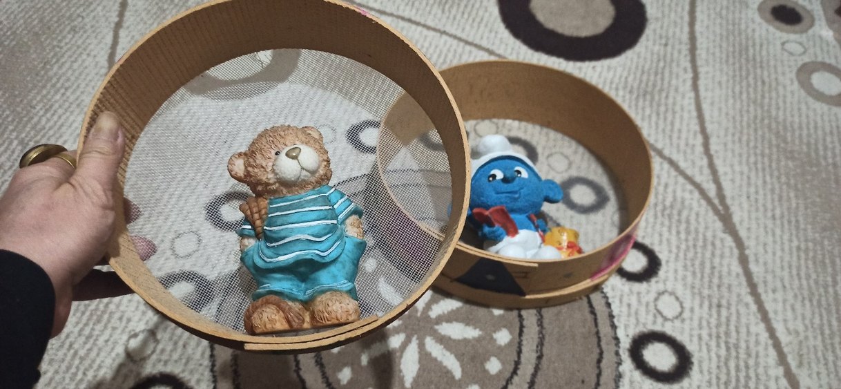 Renkli, mavi temalı ayı ve mavi figür gibi oyuncaklar yuvarlak ahşap kutularda sergileniyor.