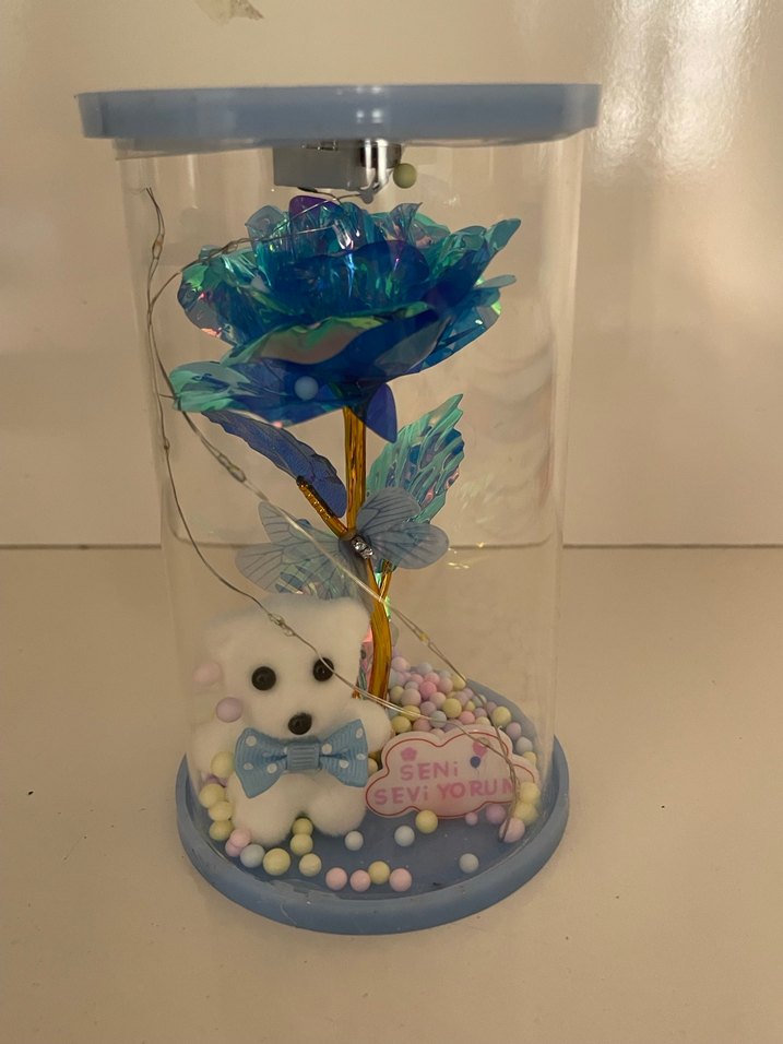 Renkli mavi gül, şeffaf fanus içinde küçük ayıcık figürü ve pastel dekoratif boncuklarla birlikte sunulmuştur. Ayıcık kalp üzerinde mesaj taşır.