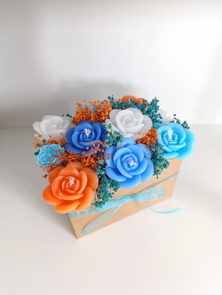Mavi, turuncu ve beyaz güller şeklinde renkli dekoratif mumlar, küçük kuru çiçeklerle kutuda ve kurdeleyle süslenmiş.
