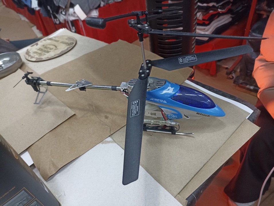 Renkli mavi oyuncak helikopter, büyük rotor kanatları ve detaylı gövde tasarımına sahiptir. Oyun ve koleksiyon için uygundur. kumandası çalışmıyor