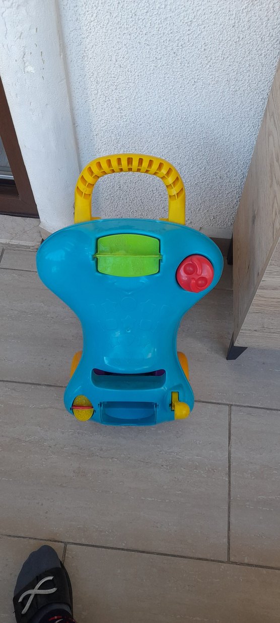 Renkli mavi gövdeye ve sarı tutacağa sahip, yürümeyi destekleyen oyuncak düğmeli bebek yürüteci.