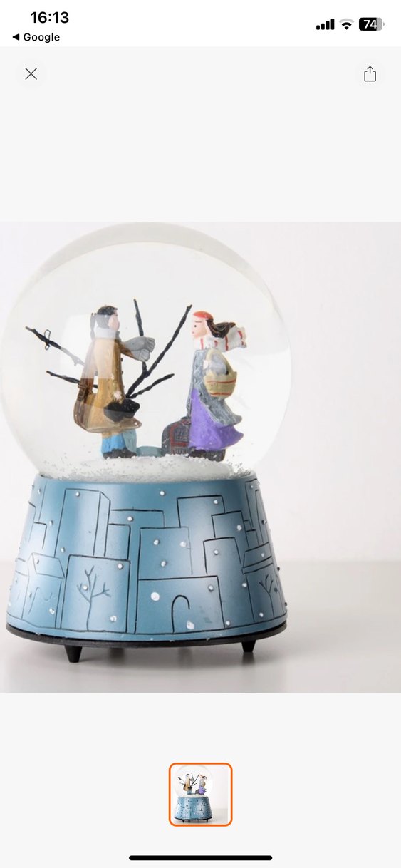 İki figürün bulunduğu renkli mavi kar küresi biblosu, detaylı tabana sahip. ❄️ müzikli sesli dönüyor