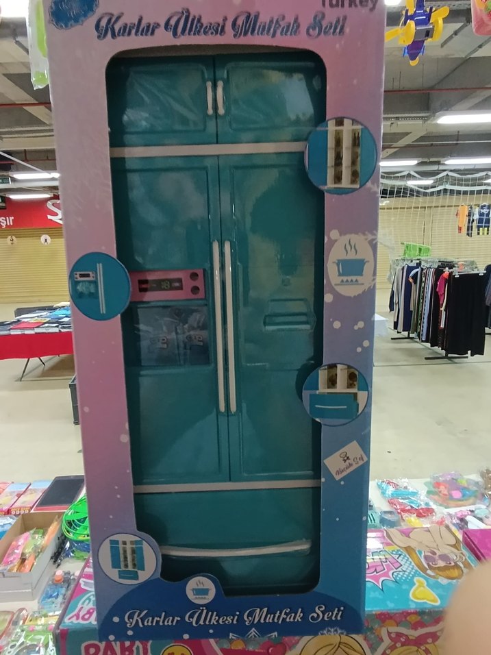 Renkli mavi oyuncak mutfak seti, buzdolabı ve fırın içerir. Karlar Ülkesi temasından esinlenmiştir. ❄️